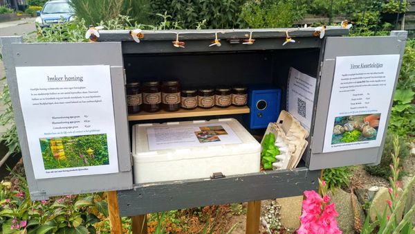 Wij zijn een enthousiast stel met groene vingers die per toeval in de stad Nijmegen terecht zijn gekomen. We hebben naast onze moestuin onder andere kippen, kwartels en honingbijen. Graag delen we een deel van deze oogst uit onze eigen tuin. Dit doen we lokaal in ons verkoopkastje aan de straat. Onze kwartels zijn ontzettend productief dus we hebben vrijwel altijd eitjes beschikbaar. In het seizoen hebben we af en toe ook andere producten en plantjes uit de tuin te koop. Kom gerust een kijkje nemen bij ons verkoopkastje en ontdek wat er vandaag voor je klaar staat!